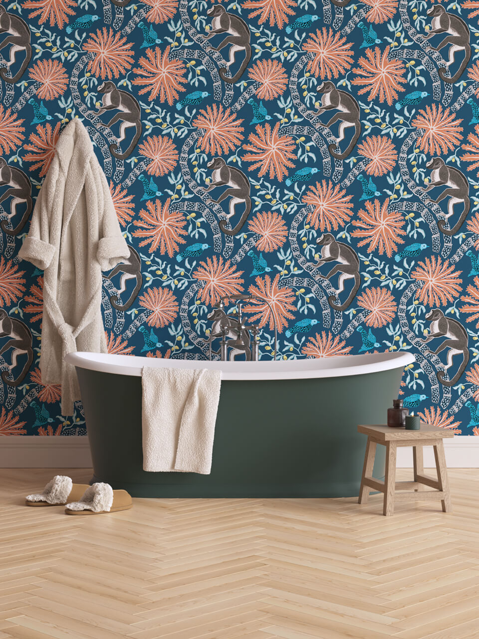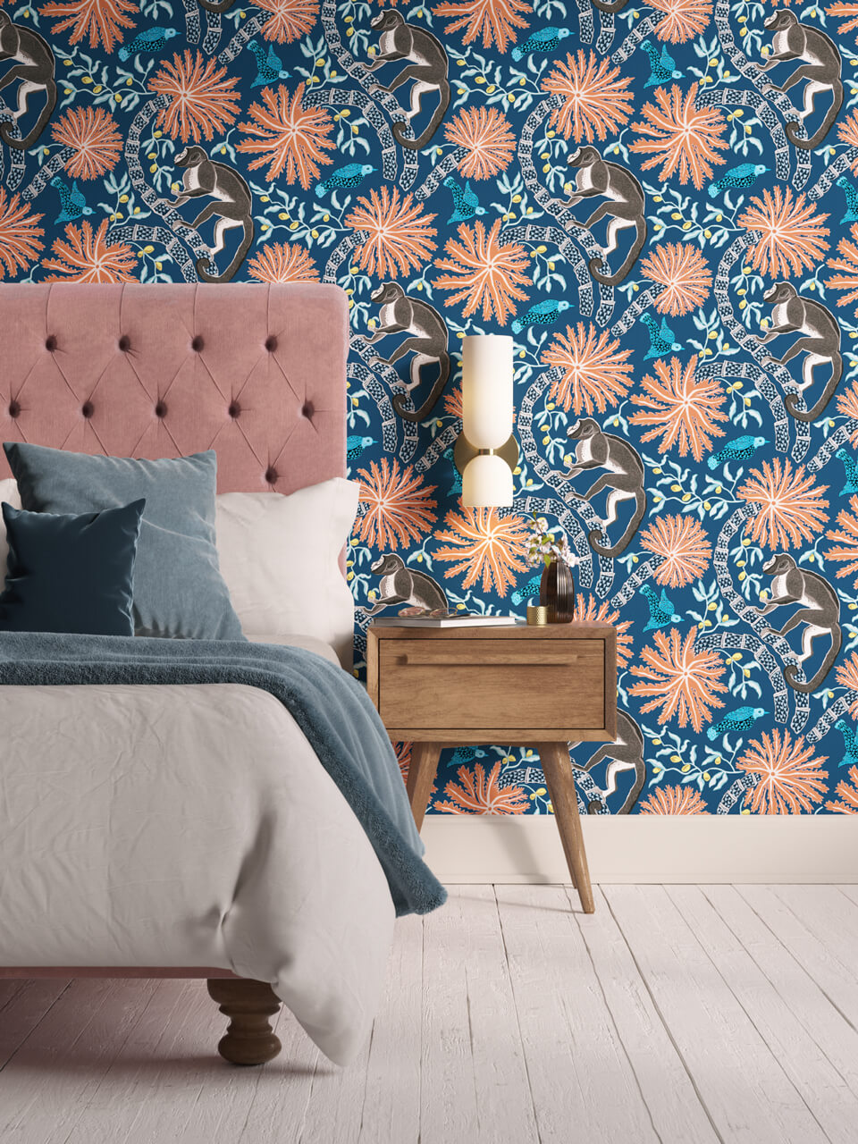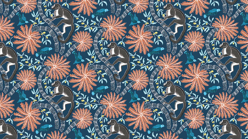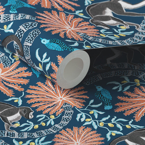Jungle mural Monkey 02 benefits from the best of both worlds – the monkey and palm motifs which make it the perfect playful tropical wallpaper, and the moody blue palette that keeps it tasteful rather than OTT, with classic paste the wall application.