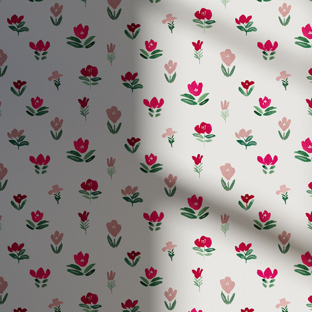 Equal parts adorable and fun, Petals 01 is a charming red and pink flower wallpaper. Individual hand-painted flowers dot the paper, punctuated with contrasting green leaves. While the white background gives it a light and cheerful finish. Available as a paste-the-wall sample and roll.