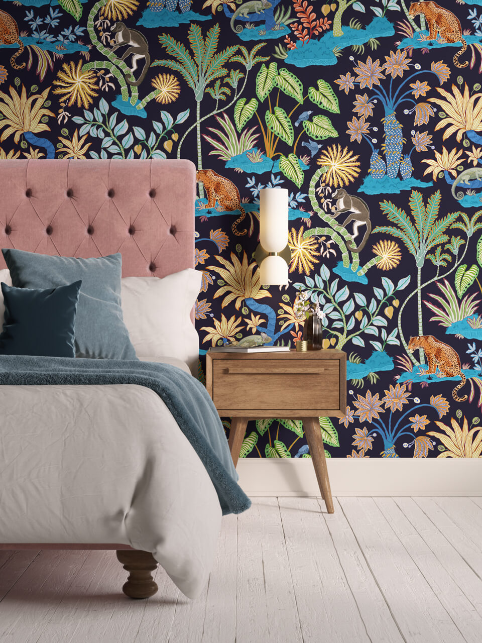 At night, the jungle comes alive – like in Rainforest 02, a maximalist tropical wallpaper with an eclectic combo of rich blues to make it feel almost iridescent. Those hues, plus the animal motifs, make this mural wallpaper perfect for playful spaces.