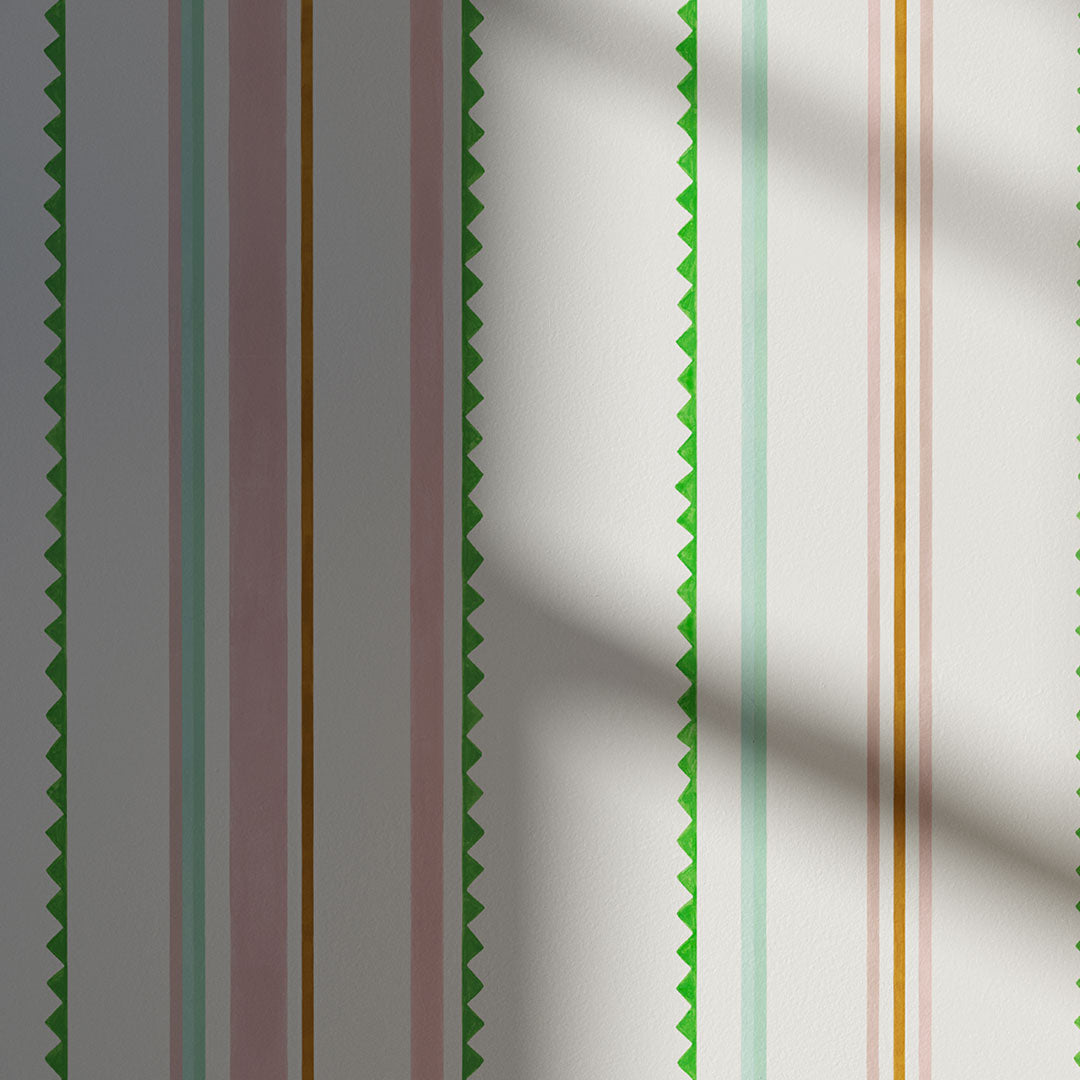 We dreamed of a pastel paradise as we brought ZigZag 01 into being! This pastel stripe wallpaper will freshen up any space instantly, featuring irregular stripes and zigzags in minty blue, neo green and hazy pink on an off-white background. Available as a paste-the-wall sample and roll.